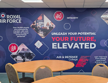 Printed vinyl application to walls is an excellent way to enhance company brand in office rooms, large areas, and corporate events.